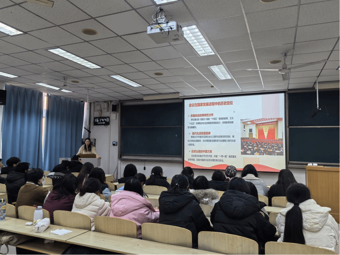 宣讲中,李昕如围绕党的二十届四中全会的重要意义、主要成果和精神实质,结合当前国家发展形势与青年责任使命,进行了系统解读和深入阐述。她重点从会议背景与历史意义、核心部署与实践路径、青年担当与行动方向三个层面展开讲解,通过理论阐释、案例分析和互动交流,帮助同学们深刻理解全会提出的系列重大决策部署,进一步坚定对国家发展方向的认同与信心。现场学习氛围浓厚,同学们认真聆听、积极思考。