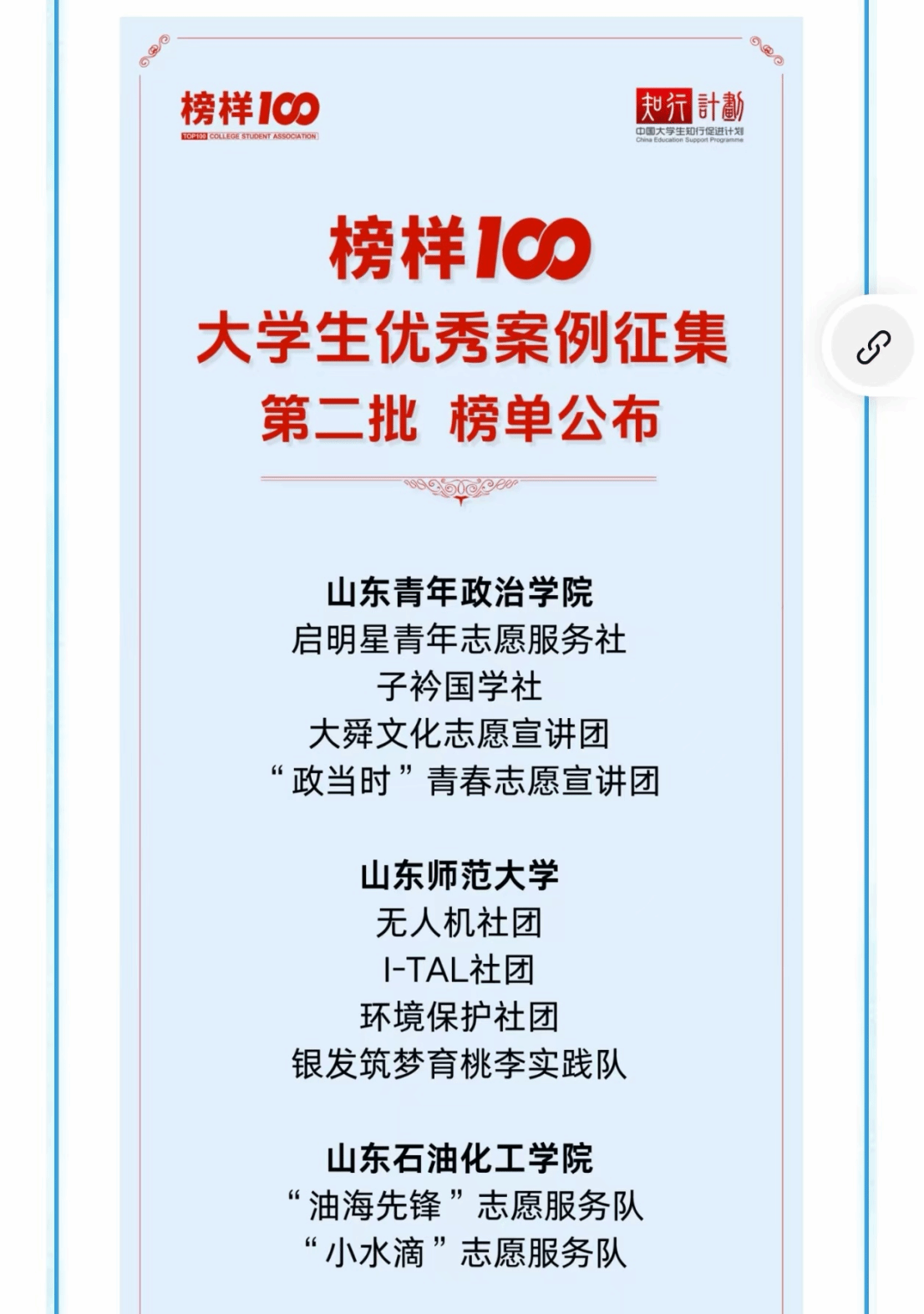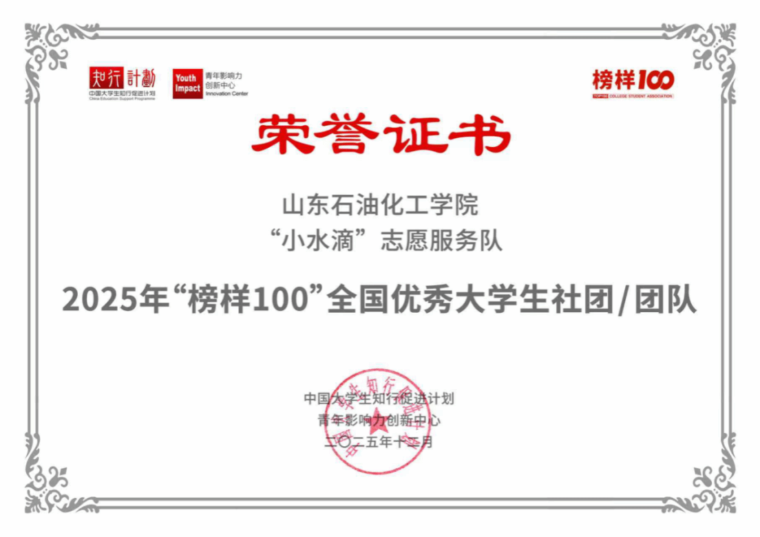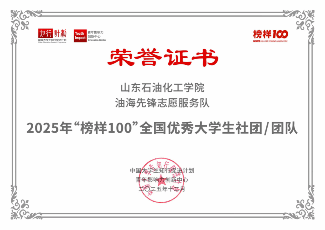 近日,2025年“榜样100”全国优秀大学生社团及团队榜单正式发布。该榜单由中国大学生知行计划与青年影响力创新中心联合发起,吸引了全国376所高校的1320支团队参与角逐。经严格评选,我校石油工程学院“油海先锋”志愿服务队和“小水滴”志愿服务队同时入选,荣获“榜样100”全国优秀大学生团队称号。