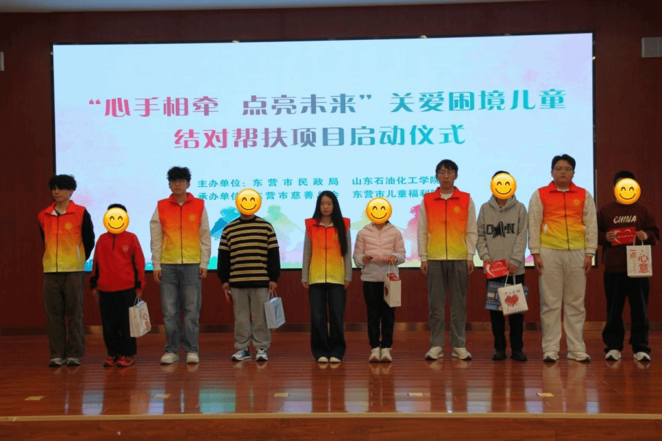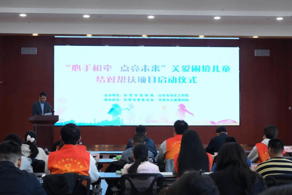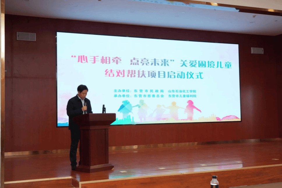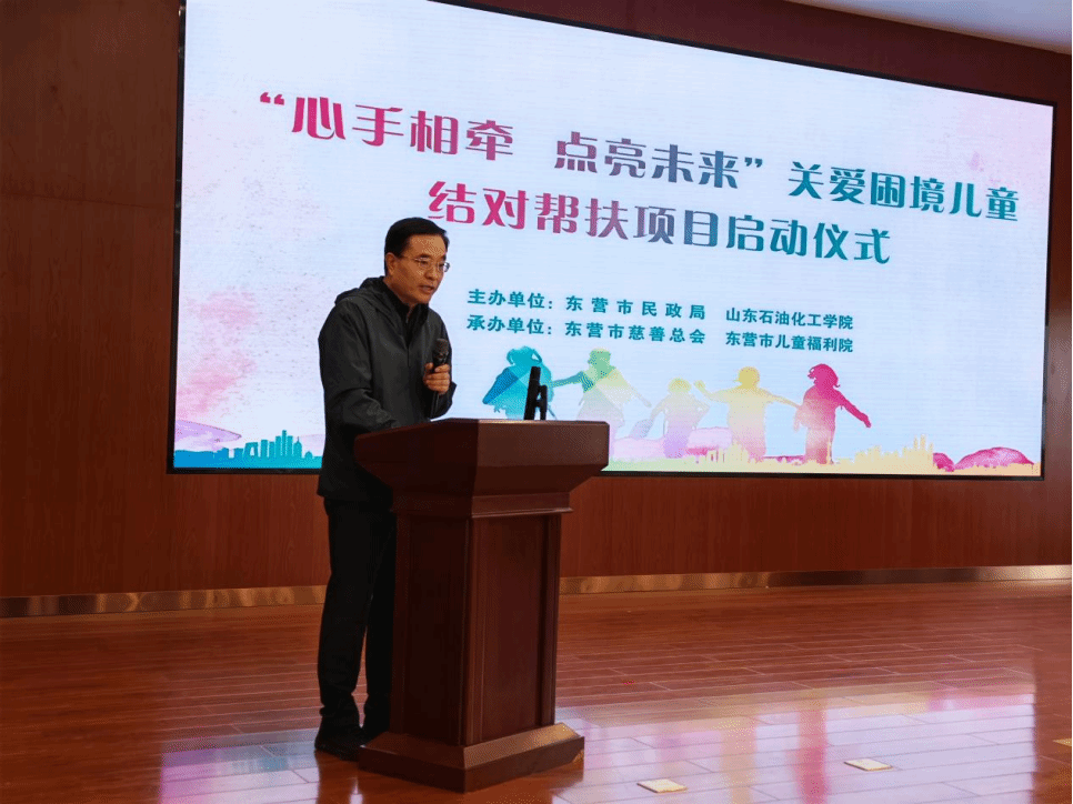3月21日上午,由山东石油化工学院与东营市民政局共同发起的“心手相牵 点亮未来”关爱困境儿童结对帮扶项目启动仪式在东营市养老中心举行。东营市关工委副主任田青云,山东石油化工学院党委委员、副校长李宗洲,市民政局党组书记、局长张锋出席活动并讲话。学校团委、学生心理健康教育中心相关负责同志及大学生爱心志愿者参加活动。