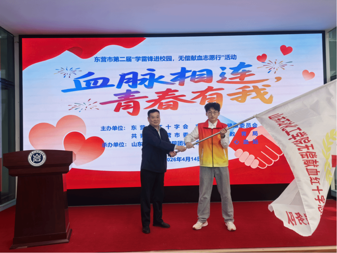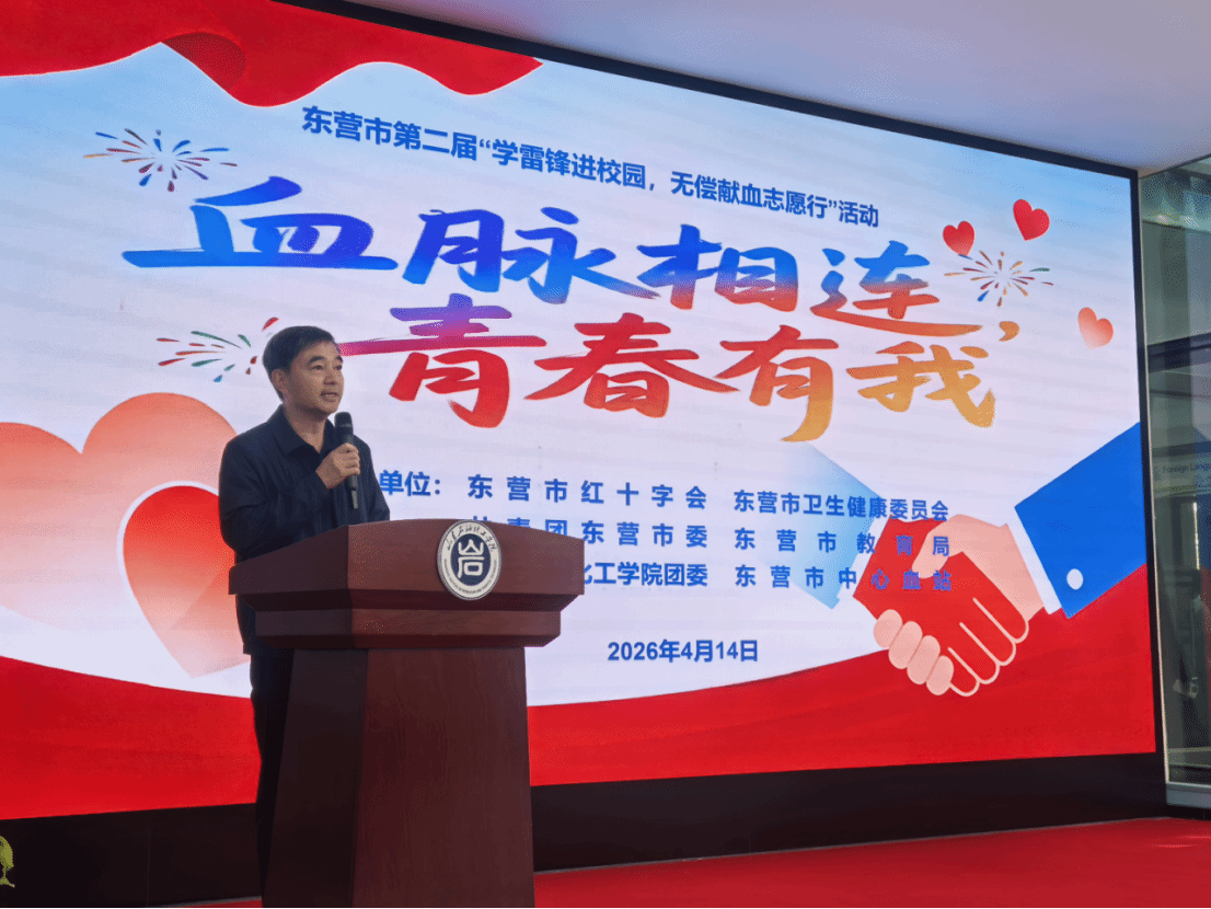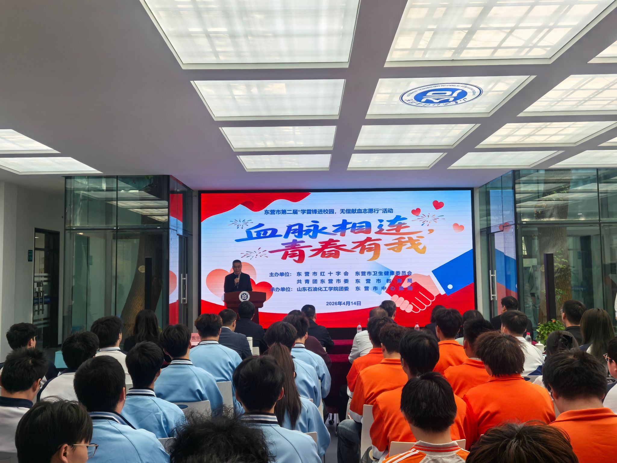 4月14日下午,东营市第二届“学雷锋进校园 无偿献血志愿行”活动启动仪式在我校大学生科创中心举行。校党委委员、副校长张思峰,市红十字会党组成员、副会长郭连玉,市卫生健康委党组成员、副主任张娟,共青团东营市委副书记隋海建,市中心血站站长周栋梁出席活动。活动由市教育局党组成员、副局长贾振华主持。市红十字会、市卫生健康委、市中心血站相关科室负责同志及我校相关部门负责同志、学生代表参加活动。
