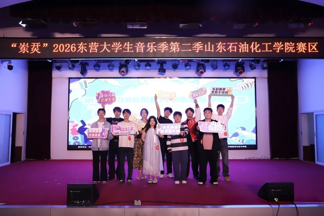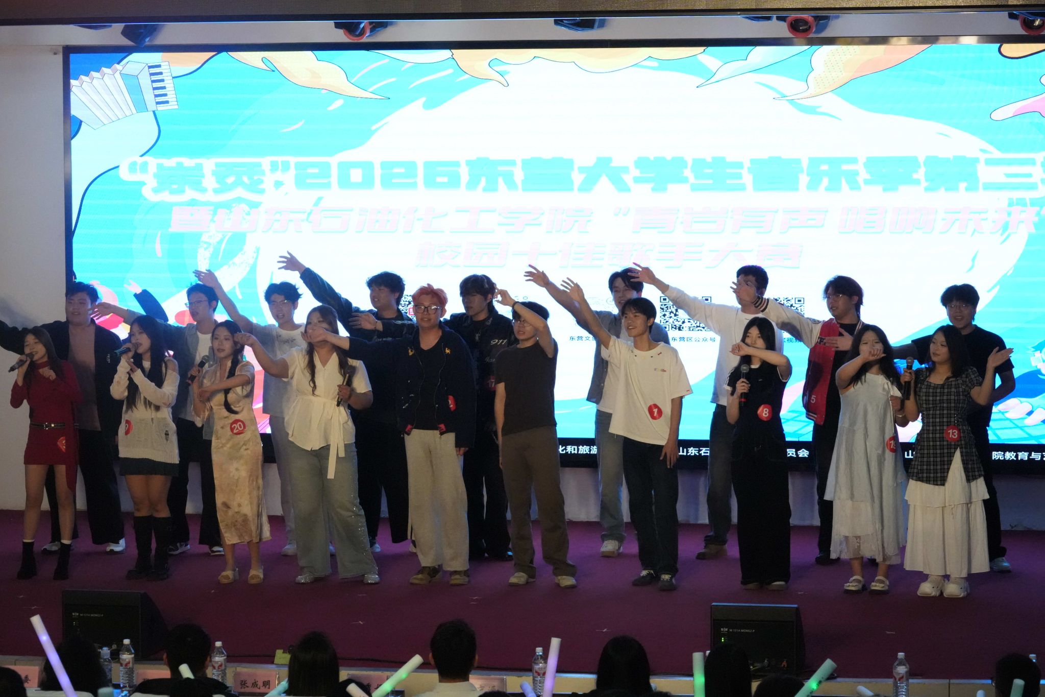 4月18日晚,由学校团委、东营区文化和旅游局主办、教育与艺术学院承办的山东石油化工学院“青岩有声 唱响未来”校园十佳歌手大赛暨“岽烎”2026东营大学生音乐季第二季选拔赛,在100号报告厅圆满收官。经过专业评审与激烈角逐,10名优秀选手脱颖而出,将代表学校冲击5月1日于东营揽翠湖旅游度假区举办的半决赛。