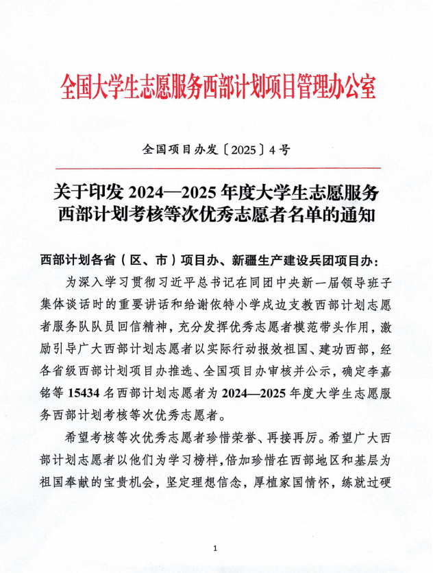 近日,全国大学生志愿服务西部计划项目管理办公室发布《关于印发2024—2025年度大学生志愿服务西部计划考核等次优秀志愿者名单的通知》,我校马彬、李季霖、胡张锐、樊海燕、韩凯舟、邢振、崔万钧等7名志愿者表现优异,获“2024—2025年度大学生志愿服务西部计划考核等次优秀志愿者”称号。其中,韩凯舟连续两年获评全国优秀。这一荣誉不仅是对我校志愿者服务工作的充分肯定,更展现出山石学子将个人理想融入国家发展、以专业能力和实干精神勇担使命的青春风貌。