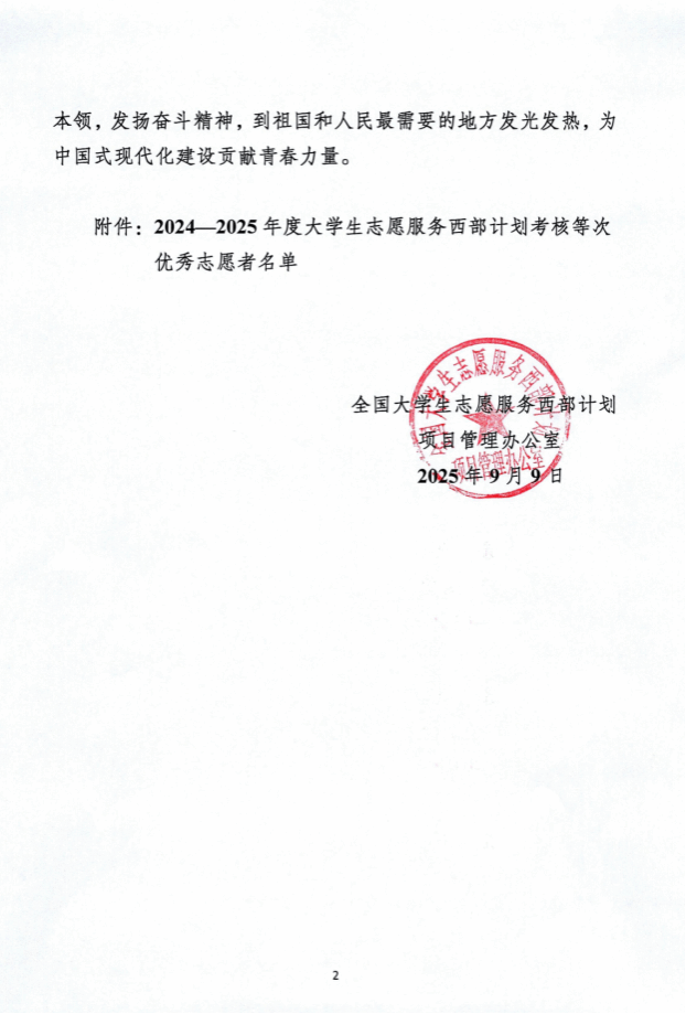 未来,学校将进一步深化“西部计划”项目的组织实施与内涵建设,引导更多青年学生以优秀志愿者为榜样,坚定理想信念、发扬志愿精神、把准时代脉搏,踊跃投身西部基层,不断唱响“到西部去,到基层去,到祖国最需要的地方去”的青春强音。