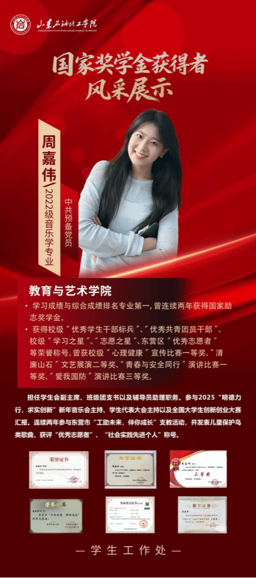 实践路上,我牵头组织红歌赛、主持新年音乐会等活动;连续两年参与东营区社会实践支教服务,以音乐传递温暖,深刻领悟“教育是用生命影响生命”的真谛,坚定了从教初心,获评东营区“优秀志愿者”、“社会实践先进个人”等。